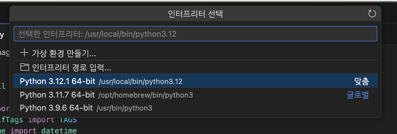 VSCODE 명령 팔레트 열기 : Command + Shift + P 1. Python: 인터프리터 선택 2. 프로젝트 폴더 선택 3. 인터프리터 경로 설정: 최근에 설치한 폴더가 맞는지 확인 아니라면 경로 입력으로 진행 공유하기 게시글 관리 난장 저작자표시 비영리 변경금지 (새창열림)