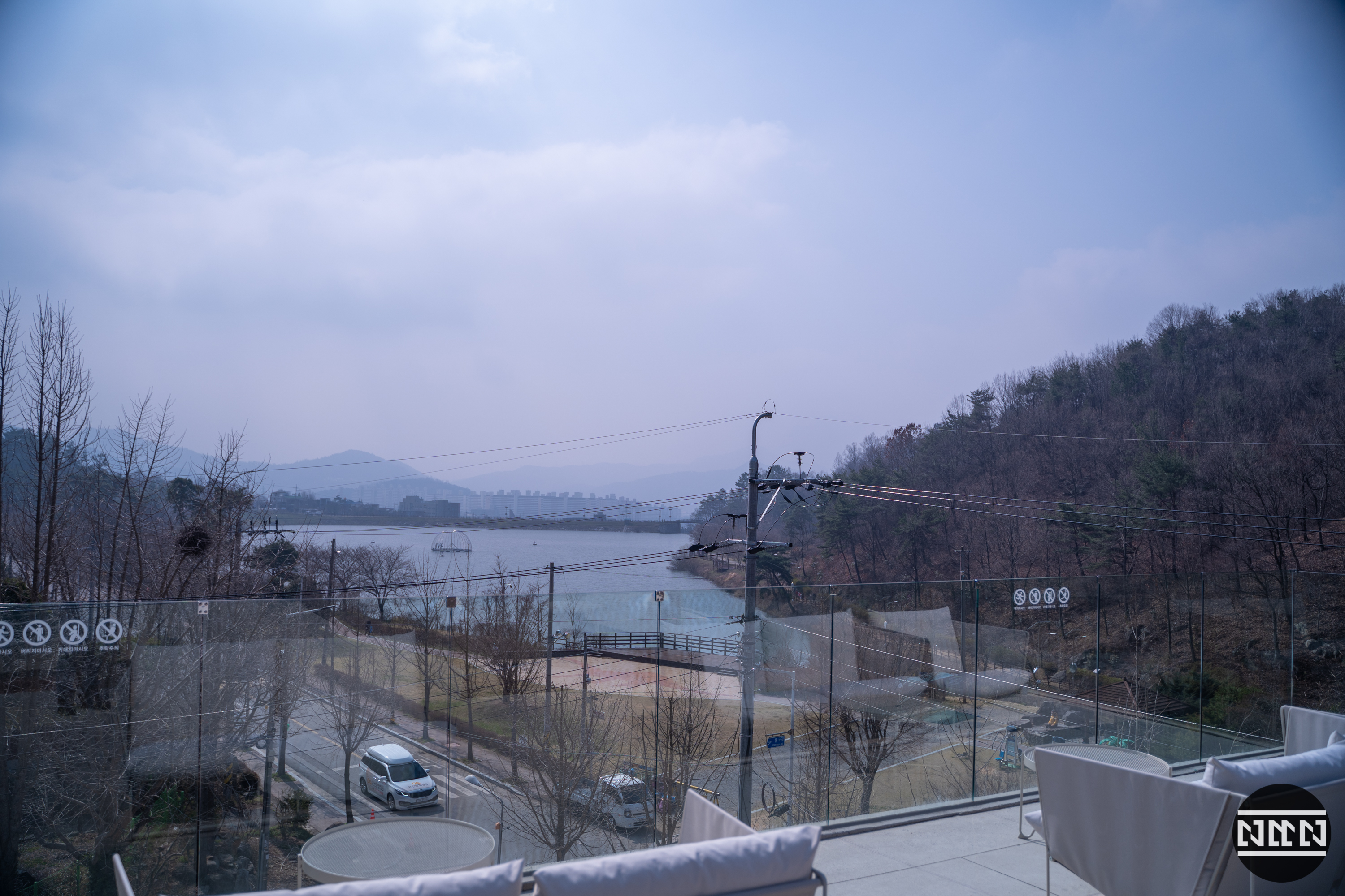 일단 이곳의 최대의 장점은 4층이라 나름 높이가 있는 건물이라는 점, 4층이 루프탑이라 하늘이 뻥~ 뚫려 있다는 점. 그리고 아래와 같이 동구리 호수가 잘 보인다는 점이 카페를 찾는 이유가 아닐까 한다.