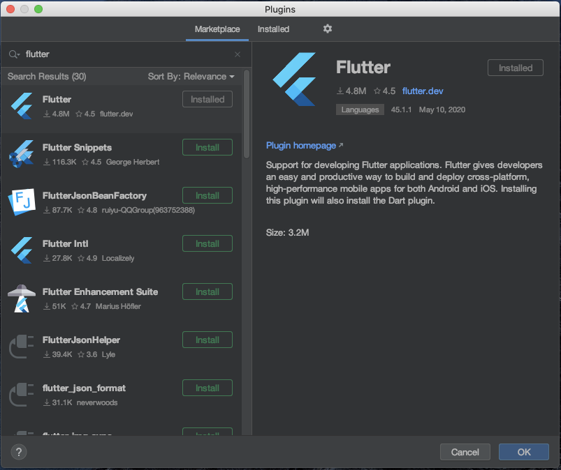 - Preferences > Plugins >> Marketplace >> Flutter 찾아서 설치 >> Dart 설치하라는 메시지 나오면 설치 >> Restart