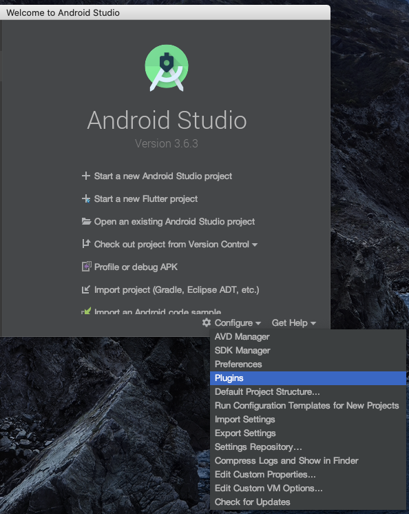 처음 실행하면 첫 화면에서 오른쪽 하단에 "Configure" 이 보임. 클릭하고 "Plugins"를 클릭