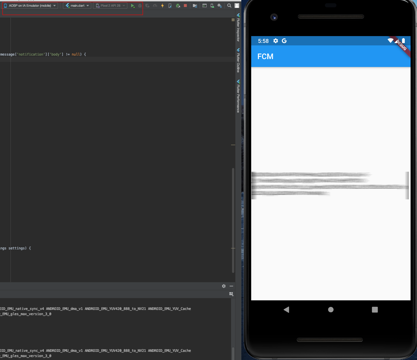 빌드하면 화면에 이 기기의 토큰 값이 출력된다. 이걸 이대로 일일이 쳐가면서 하는게 아니고 그 일을 대비해 console에 보면 토큰 값이 보이는 것을 확인할 수 있다.