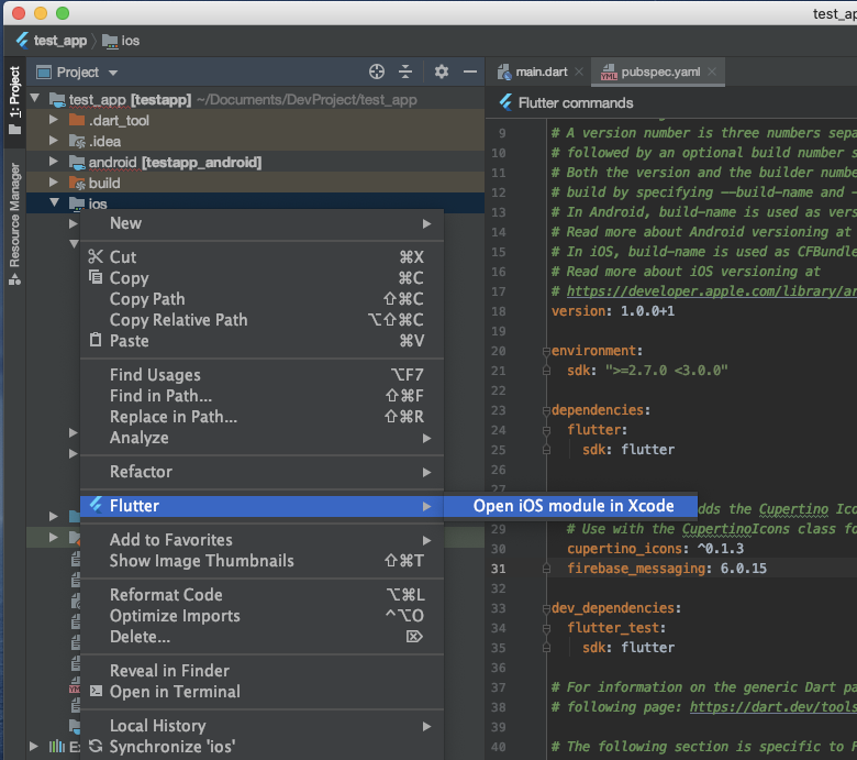 추가하고 나서 ios 폴더를 클릭한 상태에서 마우스 오른쪽을 누르고 "Flutter > Open iOS module in Xcode"를 눌러 Xcode를 실행한다.