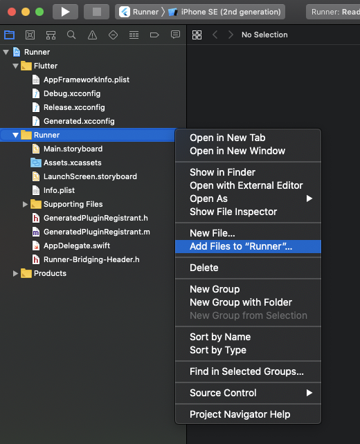 Runner/Runner 폴더를 클릭하고 마우스 오른쪽 키를 누르고 "Add Files to "Runner"... "을 누른다