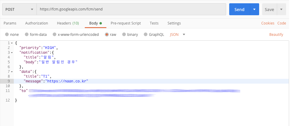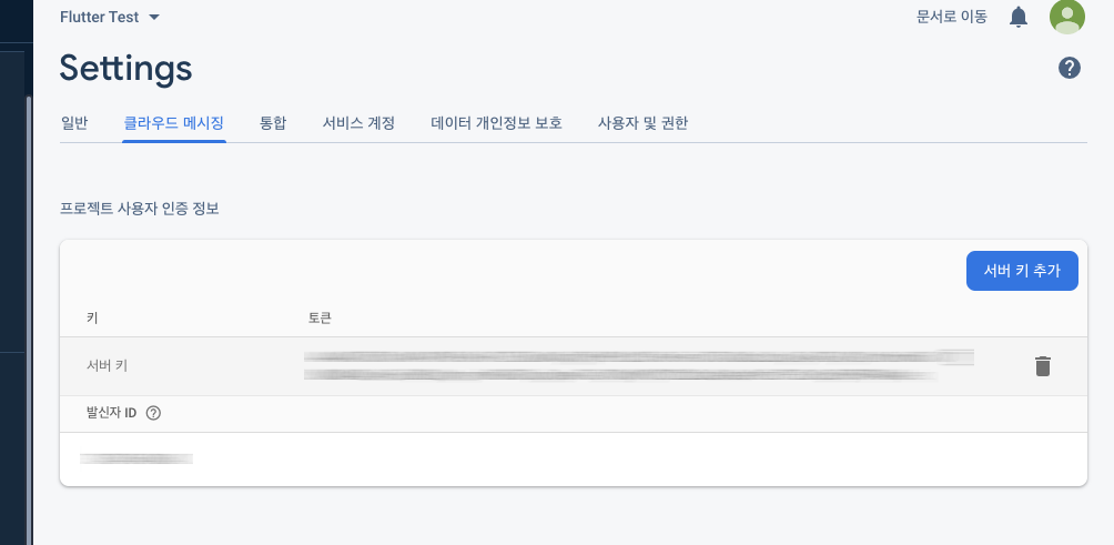 Headers에 입력해야 하는 키는 ( {{serverkey}} ) Firebase Console로 들어가 지금 작업 중인 프로젝트로 들어간다. 그리고 "클라우드 메시징" 을 클릭하면 보이는 서버 키가 위에 입력해야 하는 키이다. 길지만 모두 입력해야 하고, 남들에게 공개되지 않도록 보안에 신경써야 한다.