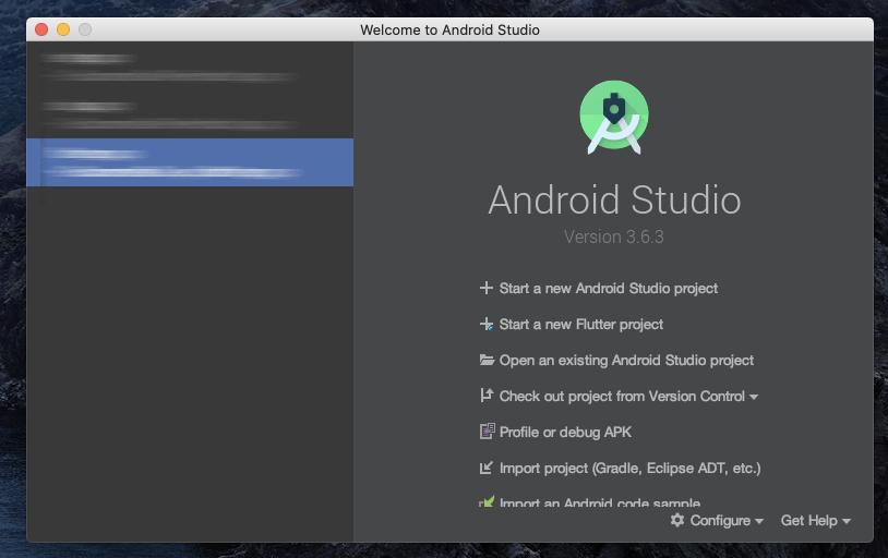 프로그램을 실행하면 아래와 같이 뜨고, 두번째 "Start a new Flutter project"를 클릭한다.