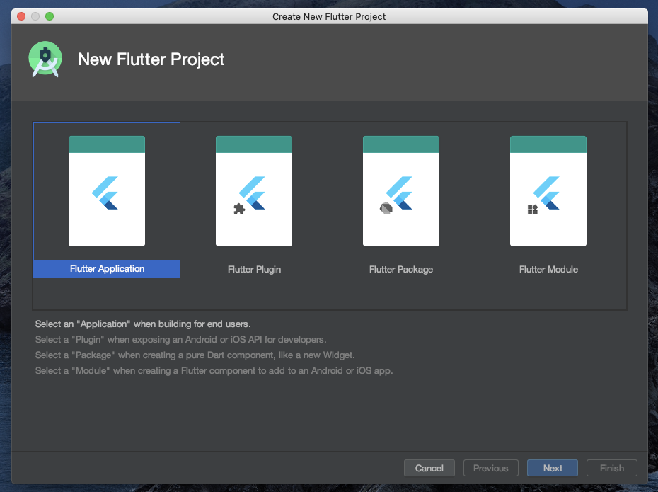 애플리케이션으로 진행해야 하므로 첫번째 "Flutter Application"을 선택.