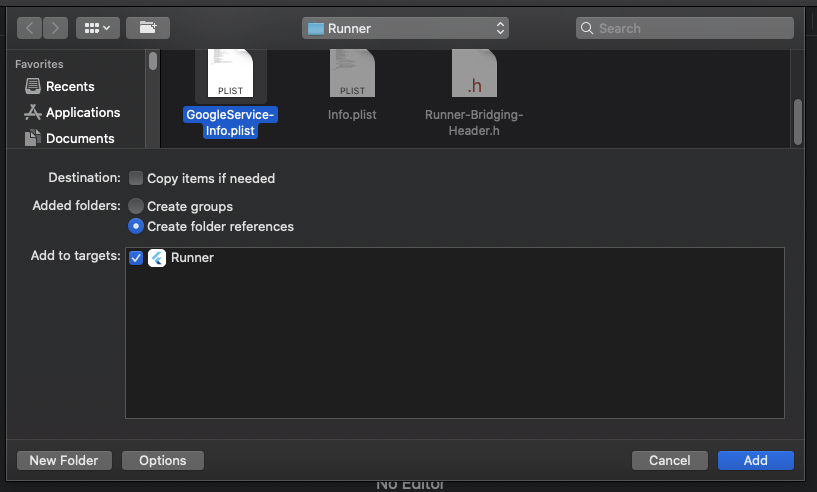 그리고 위에서 추가한 "GoogleService-Info.plist"를 선택하고 "Add"를 누른다.