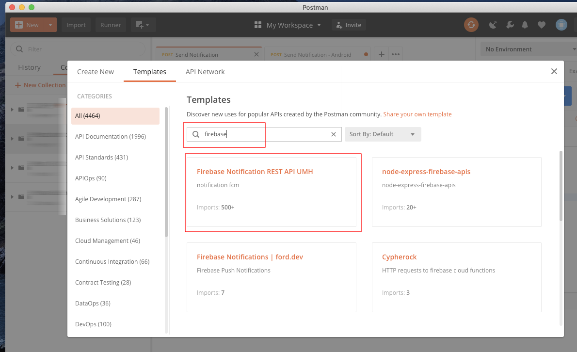그리고 Templates 탭을 선택하고 검색어에 "firebase"를 입력한다. 그리고 보이는 "Firebase Notification REST API UMH"를 클릭한다.