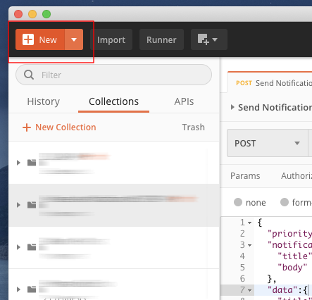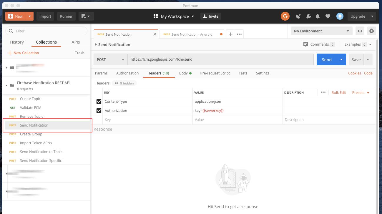 Collections에 방금전 선택한 "Firebase Notification REST API UMH"를 확인하고 안에 있는 "Send Notification"를 클릭한다.