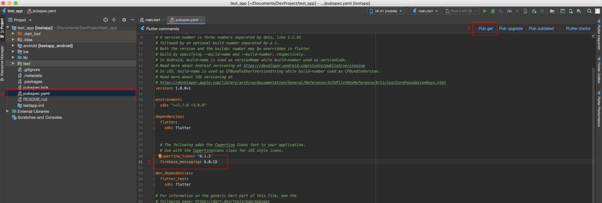 3번으로 표시된 "Pub get" 부분을 꼭 클릭해줘야 추가가 된다.